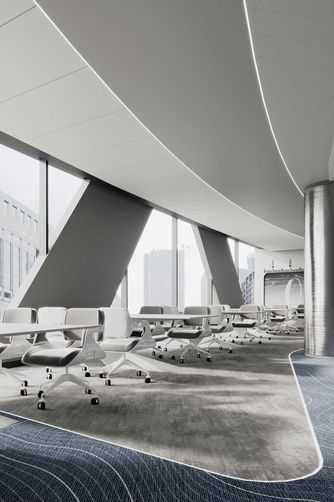 Every piece of furniture adheres to clean, defined lines, embodying the principles of practicality and clarity. The color palette, consisting of shades of grey, black, and white, provides a neutral canvas that underscores the seriousness and dedication of the humanitarian mission. In addition to using natural wooden textures are carefully incorporated into various areas of the design to infuse a touch of warmth and authenticity. The interior design strikes a balance between industrial efficiency and a human-centered approach.