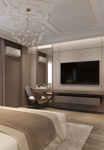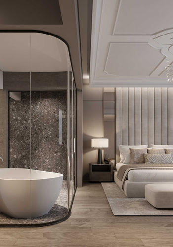 The neo-classical bedroom envelops you in a sense of tranquility with its warm and relaxing color tones, showcasing opulent textures and subtle detailing that ensure a restful and luxurious retreat.