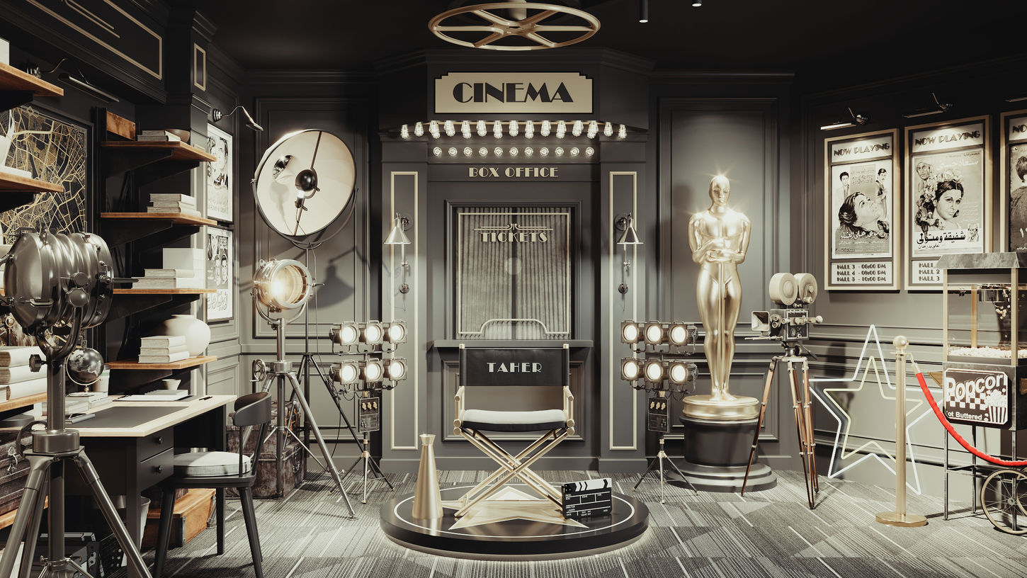 The interior design of the studio gracefully embraces the Neo-Classical architectural style, where every element has been thoughtfully selected to transport viewers into the opulent era of Cinema's golden age, while infusing it with timeless elegance. The chosen palette of deep black, regal grey, and shimmering gold sets a tone of sophistication and grandeur. Dark brown wooden textures bring warmth and depth to the space, providing a sense of timeless permanence.