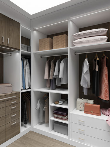 The dressing room, awash in a palette of pristine white and natural wood tones, emanates a timeless and elegant atmosphere, offering a serene and organized space where style and functionality effortlessly coexist.